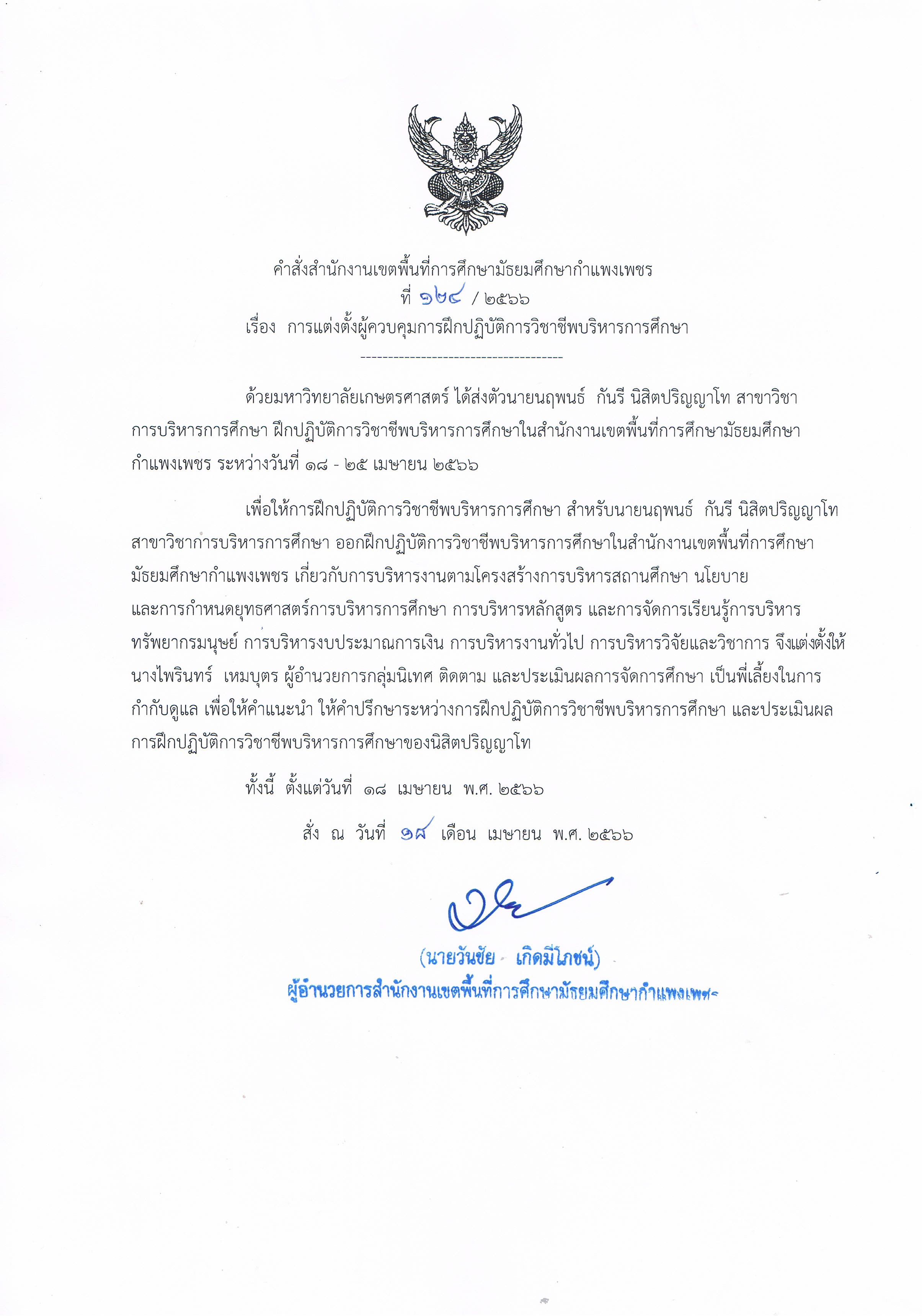 | 386 | 124/2566 | การแต่งตั้งผู้ควบคุมการฝึกปฏิบัติการวิชาชีพบริหารการศึกษา รายละเอียด : มหาวิทยาลัยเกษตรศาสตร์ ได้ส่งตัวนายนฤพนธ์ กันรี นิสิตปริญญาโท สาขาวิชา การบริหารการศึกษา ฝึกปฏิบัติการวิชาชีพบริหารการศึกษาในสำนักงานเขตพื้นที่การศึกษามัธยมศึกษากำแพงเพชร ระหว่างวันที่ 18 - 25 เมษายน 2566 สร้าง : 18 เมษายน 2566, 20:56 |
