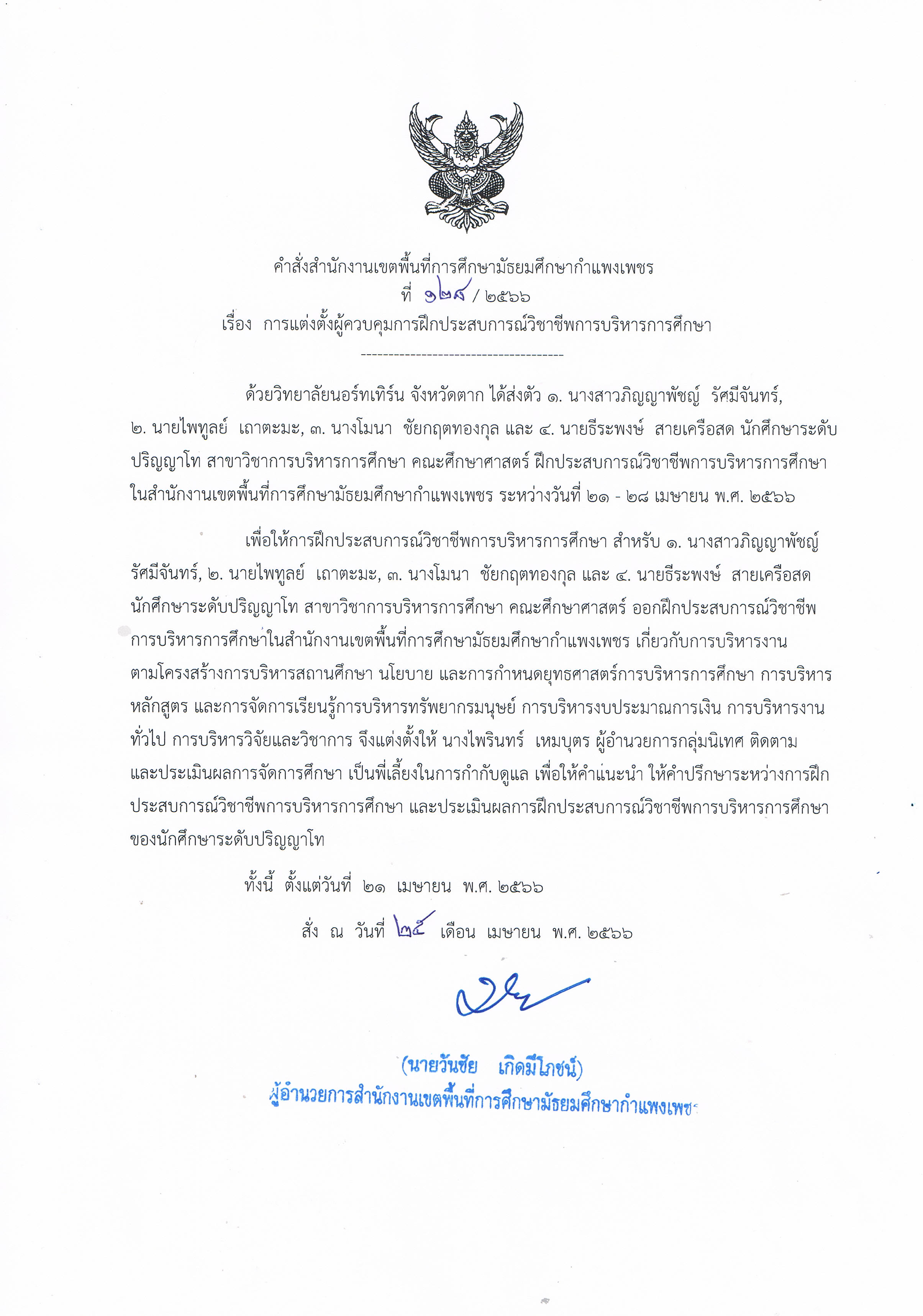 | 383 | 127/2566 | การแต่งตั้งผู้ควบคุมการฝึกประสบการณ์วิชาชีพทางการบริหารการศึกษา รายละเอียด : มหาวิทยาลัยราชภัฏนครสวรรค์ ได้ส่งตัวนางสาวปิยภรณ์ ไชยกูล และนายสหภาพ รุ่งเกสร นักศึกษาปริญญาโท สาขาวิชาการบริหารการศึกษา ฝึกประสบการณ์วิชาชีพทางการบริหารการศึกษาในสำนักงานเขตพื้นที่การศึกษามัธยมศึกษากำแพงเพชร ระหว่างวันที่ 18 เมษายน - 2 พฤษภาคม 2566 สร้าง : 21 เมษายน 2566, 16:20 |