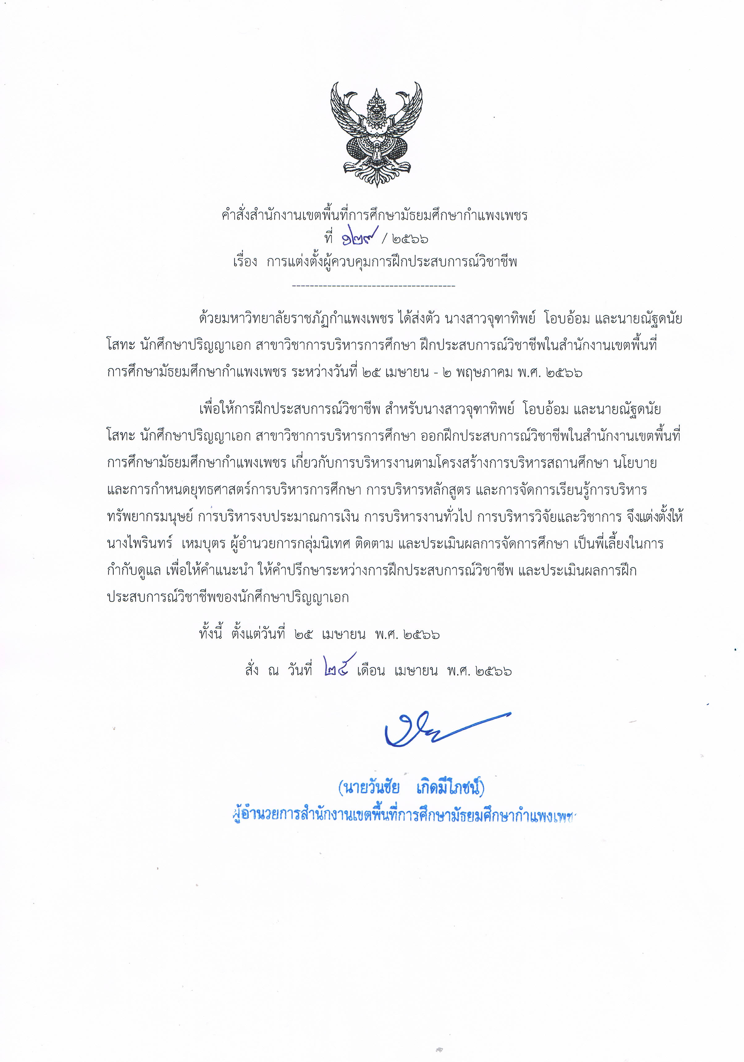 | 381 | 129/2566 | การแต่งตั้งผู้ควบคุมการฝึกประสบการณ์วิชาชีพ รายละเอียด : มหาวิทยาลัยราชภัฏกำแพงเพชร ได้ส่งตัว นางสาวจุฑาทิพย์ โอบอ้อม และนายณัฐดนัย โสทะ นักศึกษาปริญญาเอก สาขาวิชาการบริหารการศึกษา ฝึกประสบการณ์วิชาชีพในสำนักงานเขตพื้นที่การศึกษามัธยมศึกษากำแพงเพชร ระหว่างวันที่ 25 เมษายน - 2 พฤษภาคม พ.ศ. 2566 สร้าง : 25 เมษายน 2566, 13:48 |