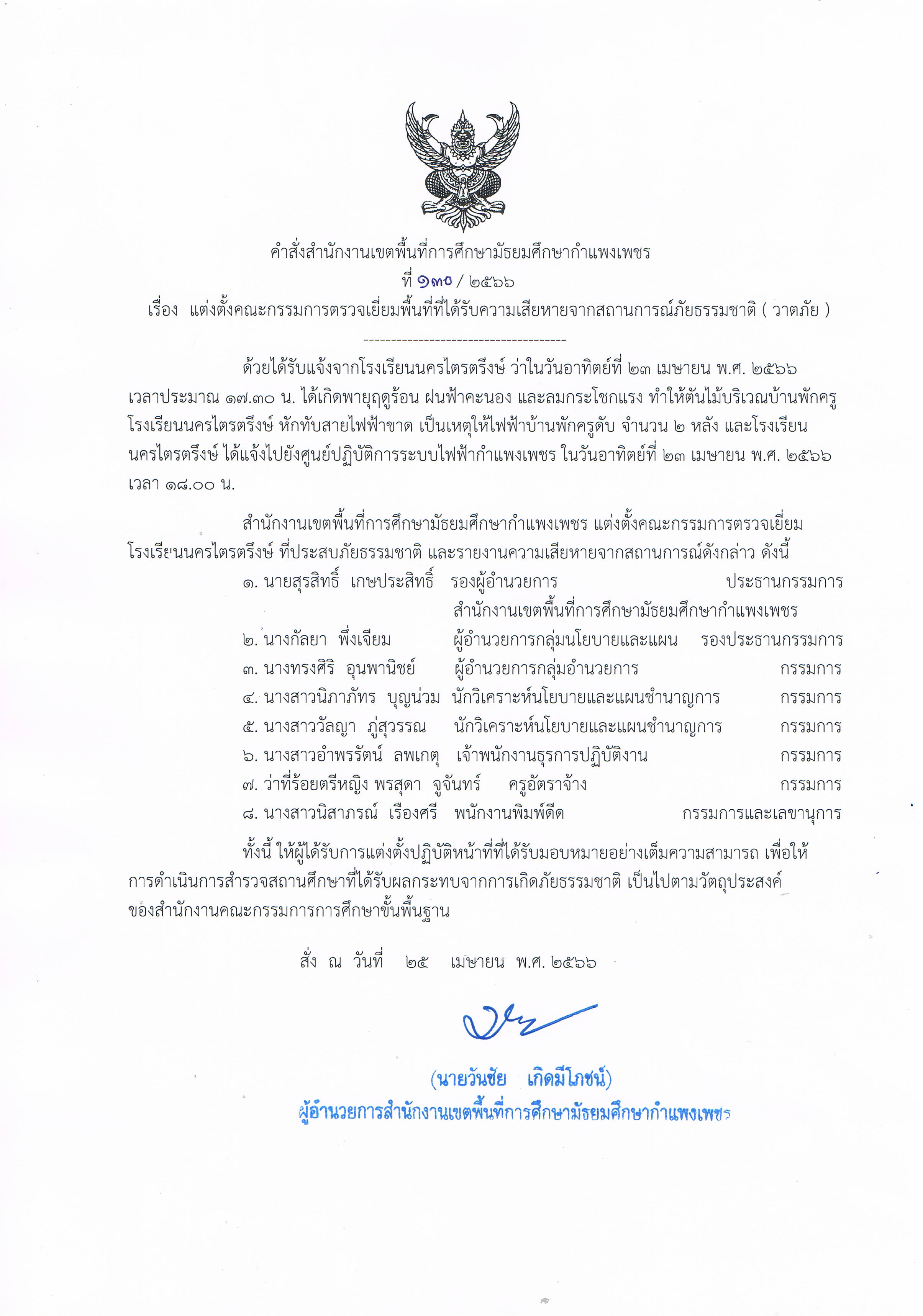 | 380 | 130/2566 | แต่งตั้งคณะกรรมการตรวจเยี่ยมพื้นที่ที่ได้รับความเสียหายจากสถานการณ์ภัยธรรมชาติ ( วาตภัย ) รายละเอียด : โรงเรียนนครไตรตรึงษ์ ว่าในวันอาทิตย์ที่ 23 เมษายน พ.ศ. 2566 เวลาประมาณ 17.30 น. ได้เกิดพายุฤดูร้อน ฝนฟ้าคะนอง และลมกระโชกแรง ทำให้ตันไม้บริเวณบ้านพักครูโรงเรียนนครไตรตรึงษ์ หักทับสายไฟฟ้าขาด เป็นเหตุให้ไฟฟ้าบ้านพักครูดับ จำนวน 2 หลัง สร้าง : 26 เมษายน 2566, 14:28 |