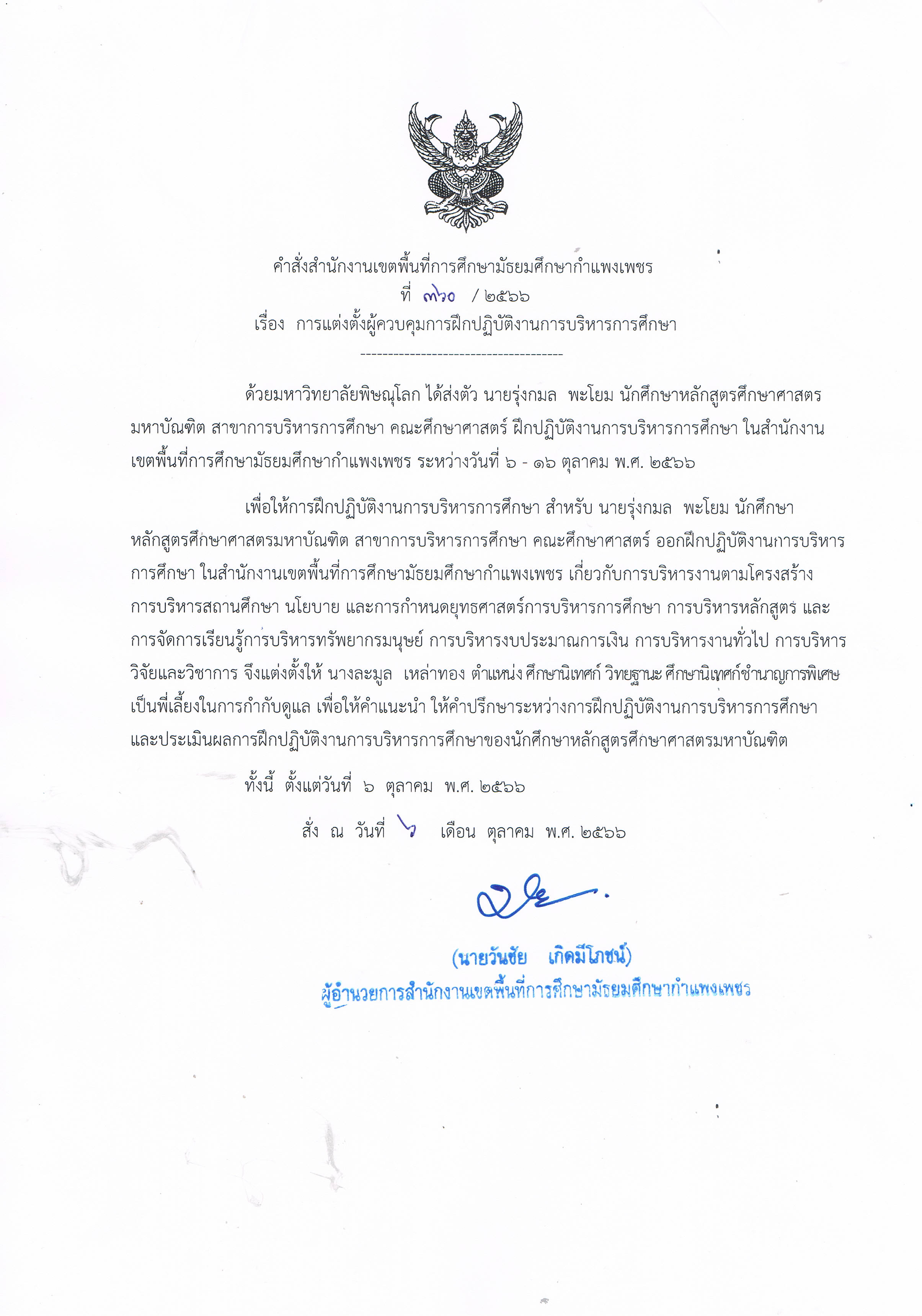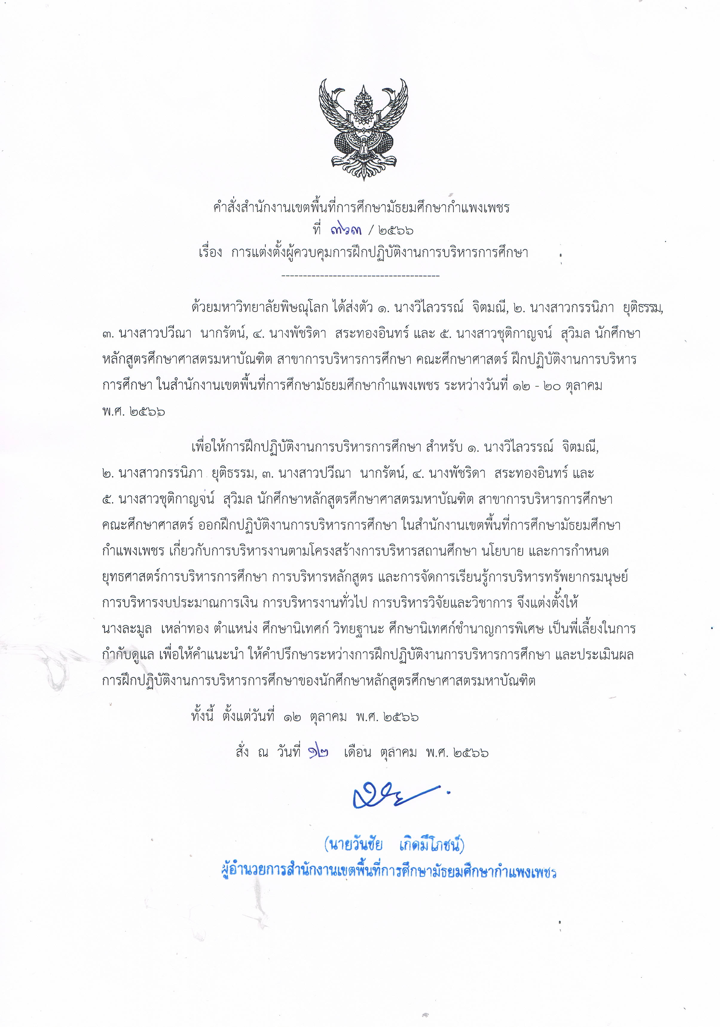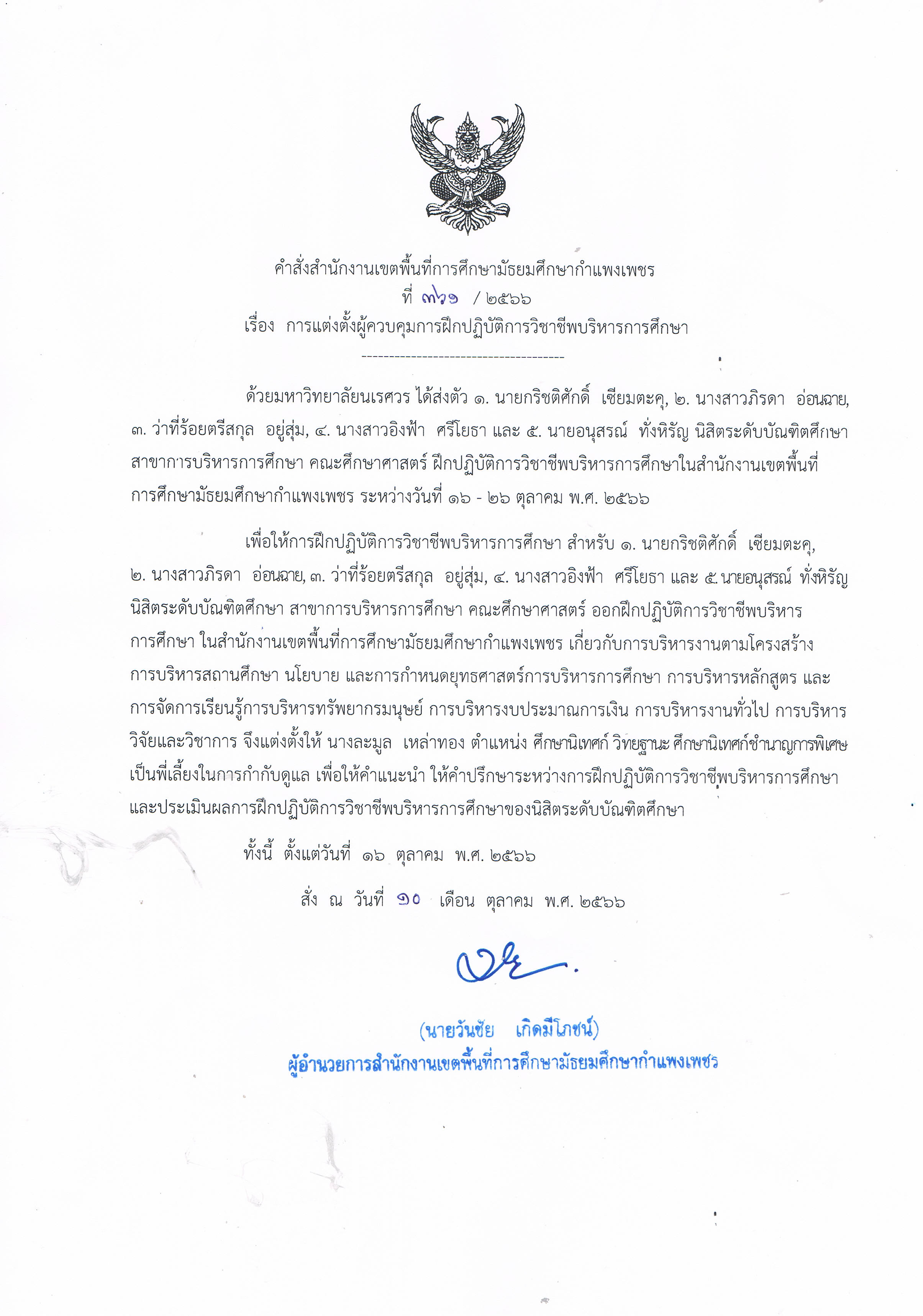 | 153 | 361/2566 | การแต่งตั้งผู้ควบคุมการฝึกปฏิบัติการวิชาชีพบริหารการศึกษา รายละเอียด : ตัว 1. นายกริชติศักดิ์ เซียมตะคุ, 2. นางสาวภิรดา อ่อนฉาย, 3. ว่าที่ร้อยตรีสกุล อยู่สุ่ม, 4. นางสาวอิงฟ้า ศรีโยธา และ 5. นายอนุสรณ์ ทั่งหิรัญ สร้าง : 10 ตุลาคม 2566, 12:02 |
